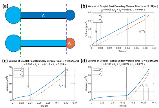 Volumes of the droplet that have passed the left and right openings of the slit (a) over time for droplet surface tension σ values of (b) 10, (c) 40, (d) and 55 pN/µm. Vertical lines delineate the time boundaries between stages II, III, and IV. Volume remains constant at stage IV due to full crossing of the slit’s left opening, and volume remains constant during stage II since the droplet does not cross the slit’s right opening until stage III.