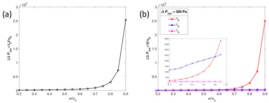 For constant surface tensions σ of 10, 25, and 40 pN/µm, the inverse transit time 1/tT was obtained for pressure drops from 1100 down to 300 Pa, which is the physiological range of pressure drop in the spleen for RBC filtration [2], as shown in Figure 3a. The inverse time vs. pressure drop (1/tT vs. ) curves for surface tensions of 25 and 40 pN/µm are approximately linear for all pressure drops, but for σ = 10 pN/µm the 1/tT vs. curve is approximately linear only above 650 Pa. Below that pressure drop, there appears to be a downwards curvature until the critical pressure is reached. The dependence of 1/tT with increasing also changes with σ. For example, the 10 pN/µm droplet has the highest relative inverse transit time at lower pressure drops, before dropping to having the lowest inverse transit time compared to the two other values of σ after increases beyond 650 Pa. Conceptually, surface tension resists the droplet’s progression through stage II, but a decreased capillary number is associated with a thinned lubrication layer. It is possible that a surface tension of 10 pN/µm at low pressure drop means that the droplet does not resist entry into the slit and is slow enough to not have a high capillary number, but increasing the pressure drop increases velocity, and therefore capillary number and lubrication layer thickness. Regardless, inverse transit time is shown to increase with pressure drop.