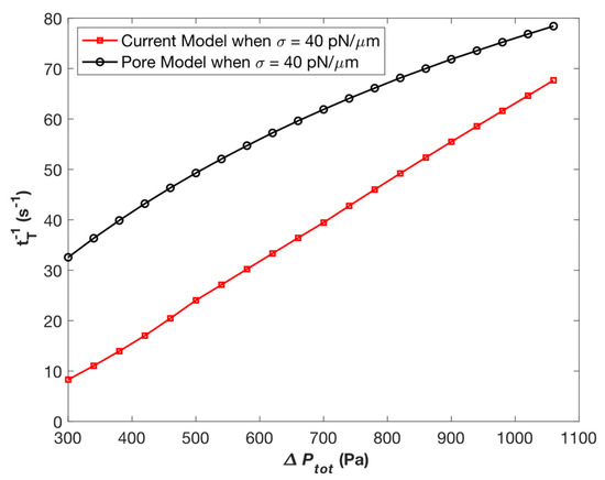 Effects of pressure drop on inverse transit time 1/tT when σ = 40 pN/µm for both the current slit model as well as the previous circular pore model.
