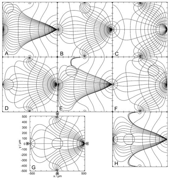 Potential and current line distributions for different positions of the 1.0-S sphere in 0.1-S medium for the (+++−)—drive mode. The position of the electrodes is sketched in (G) only. The conductances of the chamber are (A): 32.76 mS, (B): 35.03 mS, (C): 72.19 mS, (D): 34.90 mS, (E): 32.82 mS, (F): 33.34 mS, (G): 33.09 mS and (H): 32.96 mS (Table 1). The current lines were chosen to be equidistant at x = −300 µm (A), x = −250 µm (E), x = −200 µm (H), x = 50 µm (B,D,G), x = 250 µm (F) and x = 300 µm (C).