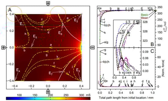 The highest force peak is generated when trajectory a hits the electrode directly. However, the force peak of trajectory b is generated in an area where the conductance changes are very moderate, and the forces generated are small (Figure 8B). Small additional force peaks are generated when the sphere hits the chamber wall near the electrode before moving along the wall to the endpoint (Figure 8C, trajectories c, j and h). Another higher force peak is generated before the sphere reaches the endpoint. The terminal steps within the conductance field often lead to negligible changes in the chamber’s conductance, resulting in very small forces. The DEP force is zero at the unstable saddle points E5 (Figure 6H), E6, and E7, but not at the stable endpoints E1, E2, E3, and E4, where the motion of the sphere comes to a stop, and the DEP force is (experimentally) compensated by the wall pressure.