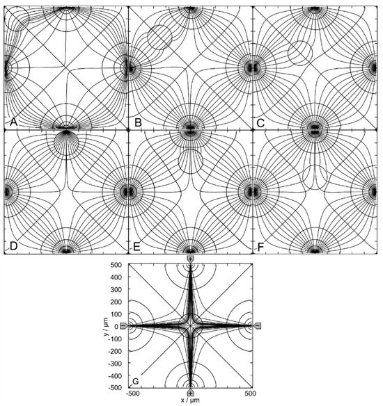 Figure 11 shows the results for the 1.0-S sphere in the 0.1-S medium. However, the field-cage mode has simultaneous horizontal, vertical and diagonal mirror symmetry lines, increasing the number of sibling positions. While the center position G is unique, positions A through F each have three siblings. In Figure 11, the sphere is clearly inhomogeneously polarized at all positions. The conductance of the chamber increases in the order w/o < G < F < A < C < B < E < D. Accordingly, D and G are the most and least favorable positions, according to LMEP. The conductances of the seven positions are elements of the 160 × 160 conductance matrix (Table S5, Supplementary Materials). When equidistant current lines were chosen at x = 40 µm for calculating the equipotential and current lines, all current lines from the left negative electrode ended on either the top or bottom electrode. Additional runs were performed for the right half of the chamber to complete the plots.