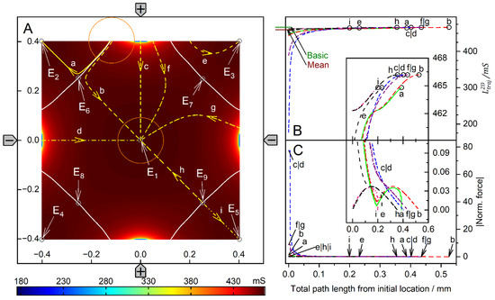 The highest force peaks are observed at trajectories b and d, which hit the electrode directly and almost directly, respectively. The DEP force is zero at the unstable endpoint E1 and at the unstable saddle points E6, E7, E8, E9, but not at the stable endpoints E2, E3, E4, E5. Again, except for the direct electrode hit (trajectory b), from Equation (2) only minimal forces result for the end steps within the conductance field. Experimentally, when the sphere’s motion stops, the DEP force at the terminal point is compensated for by the pressure on the electrode.