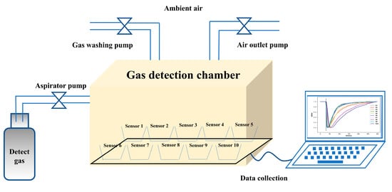 Figure 3 shows the schematic of the electronic nose system used in this work, which consists of three components: a gas sensing array (10 homemade MEMS metal oxide sensors; because different sensors have different sensitivities to different gases, it is better to choose sensors with high sensitivity for different practical applications) [,]; a gas collection module; and a data acquisition module. The sensor parameters of the gas sensing array are listed in Table 1. The gas collection module is made of a 2L PE box and equipped with three pumps (the flow rate is approximately 800 mL/min). During the whole process of the experiment, the equipment, including the pumps, is controlled by a computer. The data acquisition module collects the response signal of the electronic nose to the detected gas and transfers it to the computer.