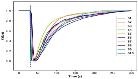 where x, min (x), and max (x) represent all the original data of each sensor, the minimum, and the maximum value in the data, respectively. Figure 4 shows the result curve of the raw data processed according to Formular (10). The horizontal axis represents the detection time, and the vertical axis represents the value after the change in the original data. It can be observed that the sensor array reached a stable state during the preheating phase (0–30 s). When the gas enters the detection chamber (30 s: black dashed line), the resistance values of the sensor array will decrease with the increase in the concentration of the gas. After stopping the gas supply, the resistance values of the sensor array return to the initial steady state with time.
