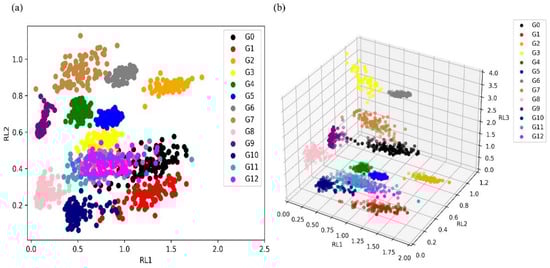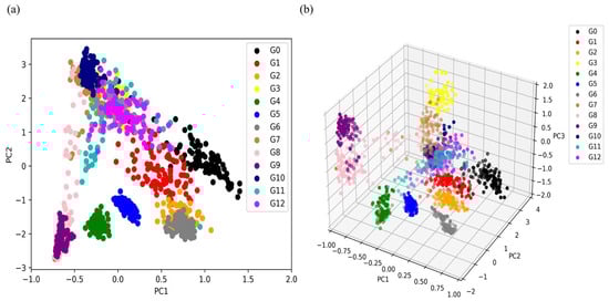 Figure 7 shows the visualization results of the original feature dataset after dimensionality reduction using PCA. It can be observed that when only the first two principal components are focused, there is a large amount of overlap between different categories, indicating that PCA cannot classify well (Figure 7a). Figure 7b shows the sample visualization distribution when applying the first three principal components. Here, the displayed classification effect is more obvious. It can also be seen that the ability to distinguish different samples has improved, but there are still some overlapping samples.
