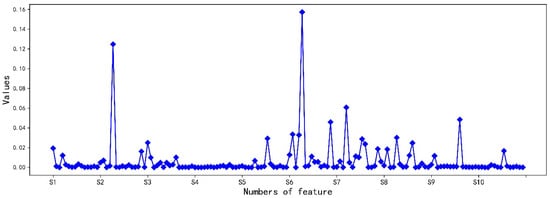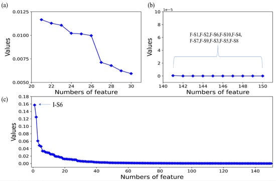 Figure 8c shows the percentile weight values obtained using the RFE-LightGBM method for the features. The feature with the highest score is I-S6 (which is the integral feature of the sixth sensor), which means this feature provides the greatest information gain in classification. In contrast, as shown in Figure 8b, all the fractional difference feature contribution values were zero. This means that this type of feature is completely unhelpful for the classification. In addition, it can be seen in Figure 8a that only 26 features have contribution values higher than 0.01. Therefore, in order to reduce the dimensionality of the feature dataset, features with relatively low contribution rates could be discarded.