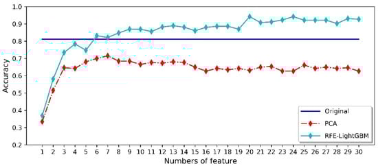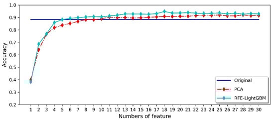 In order to compare the influence of different feature processing methods on the final classification results, 80% of the data from three datasets (randomly divided among the original feature dataset, PCA dimensionality reduction dataset, and RFE-LightGBM dimensionality reduction dataset) were used for model training. The remaining data were used for model validation, and the results obtained are shown in Figure 11. The original feature dataset (1-150 dimensional features) obtained an average classification and identification accuracy of 88.38%. At the same time, one can also see that most PCA methods achieved lower accuracy than the RFE-LightGBM method. Compared with the PCA method, the RFE-LightGBM method can not only reduce the dimensions of the original feature dataset, but also obtain 94.84% classification accuracy using the first 18 features.