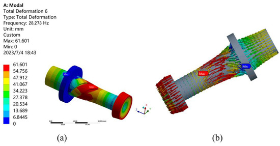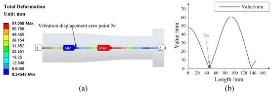 According to the predetermined size parameters of the horn, the horn and the grinding wheel are modeled by SolidWorks 2018 software and imported into the finite element analysis software ANSYS 16.0. The path is added in a longitudinal direction, and the modal analysis result is shown in Figure 3a. The vibration displacement zero point has a deviation, which is considered to be the influence of the applied tool head. As shown in Figure 3b, the zero point of vibration displacement changes to 46.667 mm.
