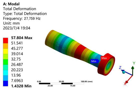 By slightly adjusting the size of each section and performing modal analysis, the vibration mode is continuously optimized, and finally, a better vibration mode is obtained under the size of L1 = 52 mm, L2 = 56 mm, and L3 = 37 mm. The modal analysis result of the longitudinal vibration horn with tool head is shown in Figure 4. The resonance frequency is 27,759 Hz, which is 241 Hz less than the theoretical design frequency of 28,000 Hz, and the error is 0.9%. According to Table 1, the frequency error requirement is 5%. Therefore, the frequency error is within the allowable range and meets the requirements.