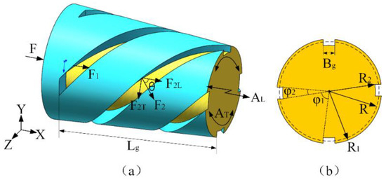 It can be seen from Equation (25) that the longitudinal-torsional mechanical conversion coefficient nT is related to R1, R2, φ1, φ2, and θ. That is, it is related to the groove depth, the number of the spiral grooves, the groove width, and the spiral angle. As shown in Figure 5, the width of the spiral groove is Bg, the length is Lg, the number is N (generally N = 4), and the spiral angle is θ. Since the conical section has a tilt angle, the depth of the spiral groove is not a fixed value, so the radius R2 of the spiral groove bottom cylinder is used to characterize the depth of the spiral groove. The larger R2 is, the smaller the depth of spiral groove; the smaller R2 is, the greater the depth of the spiral groove.