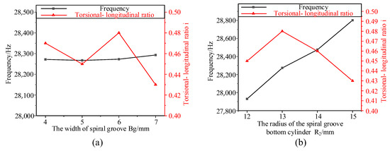 The results of the ANSYS analysis are shown in Figure 6. In Figure 6a, with the increase in Bg, the frequency f changes little; And, i decreases first and then increases and then decreases again and reaches the maximum at Bg = 6 mm, so the spiral groove width Bg is determined to be 6 mm. Then, the effects of different R2 on frequency f and torsional-longitudinal ratio i are analyzed. As shown in Figure 6b, with the increase in R2, the frequency f also increases, and the torsion ratio i increases first and then decreases, reaching the maximum when R2 = 13 mm. Therefore, the parameters of the spiral groove are all determined, as shown in Table 6.