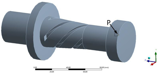 As shown in Figure 8, in order to analyze the vibration characteristics of the outer circle of the grinding wheel, a point P on the outer circle of the grinding wheel is selected for transient dynamic analysis. The longitudinal displacement excitation (where A = 1 μm, f = 28,273 Hz) is applied to the large end of the horn. And, the vibrational displacement of particle P on the grinding wheel in the X, Y and Z directions is the output. The transient dynamics analysis takes 30 cycles, and each cycle is divided into 20 time periods. The analysis results are shown in Figure 9.