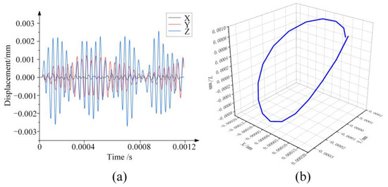 From the analysis results, the vibration displacement in the Z-axis direction is the longitudinal vibration amplitude AL of particle P and the vibration displacement in the Y-axis direction is the torsional vibration amplitude AT of particle P. From Figure 9a, the torsional-longitudinal ratio i = AT/AL = 0.48. As shown in Figure 9b, the spatial vibration displacement trajectory of particle P in one period is an approximate elliptic curve.