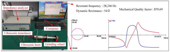 (2) The impedance analysis results showed that the resonant frequency f was 28,246 Hz and the error was 0.88% compared to the theoretical design frequency. The amplitude test results showed that the maximum amplitude of the grinding wheel (d4 = 50 mm, L4 = 15 mm) was 2.5 μm of AL and 1.1 μm of AT. The torsional-longitudinal ratio i was 0.44.