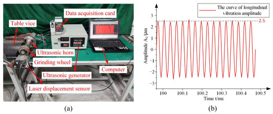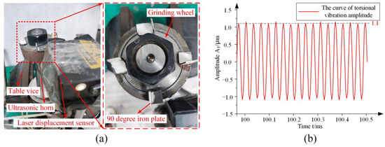 As shown in Figure 11a, the amplitude measurement device consisted of the laser displacement sensor (LK-G10, KEYENCE, Osaka, Japan), an ultrasonic generator, and a computer. The laser displacement sensor was used to focus a laser beam on the output end-face of the grinding wheel. In order to simulate the fixed constraints of the flange during simulation and actual installation, a table vice was used to clamp the flange for more accurate amplitude measurements. After the output of the ultrasonic generator is stable, the amplitude test was carried out.