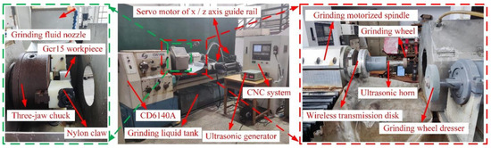 As shown in Figure 13, the longitudinal-torsional ultrasonic vibration internal grinding test of GCr15 steel was carried out on a machine tool modified from a CD6140A lathe. The GSK980TDC numerical control system control cabinet, a grinding wheel dresser, an X/Z axis grinding processing platform, and the longitudinal-torsional ultrasonic horn were auxiliary configured. During the machining process, the horn and the grinding wheel were driven by the grinding motorized spindle to rotate at a high speed, and the precision chuck and the insulating jaw clamped the workpiece and drove it to rotate. The X-axis servo motor drove the motion platform and the grinding motorized spindle through the precision ball screw and the linear guide and realized the radial feed motion of the grinding wheel. The Z-axis servo motor drove the workbench and motorized spindle to move along the longitudinal direction through the precision ball screw, so as to realize the rapid positioning of the grinding wheel. The machining shield was used to prevent the grinding fluid from splashing, and the grinding fluid was collected into the grinding fluid tank through the reflux pipeline. The grinding dresser was used to perform surface modification after the grinding wheel was worn during the machining process to ensure the equal height of the abrasive grinds on the grinding wheel surface.