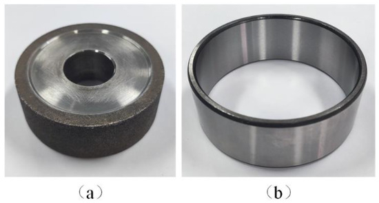 The conical transition longitudinal-torsional composite ultrasonic horn designed in this paper was used in the experiment. The tool was a titanium alloy matrix and bronze bond CBN grinding wheel, as shown in Figure 14a. The grinding wheel had a diameter of 50 mm, a width of 15 mm and was 100# in grit size. The workpiece was a GCr15 steel bearing ring, as shown in Figure 14b, with an inner diameter of 100 mm, an outer diameter of 110 mm, and a width of 40 mm. The material properties of the workpiece are shown in Table 7.