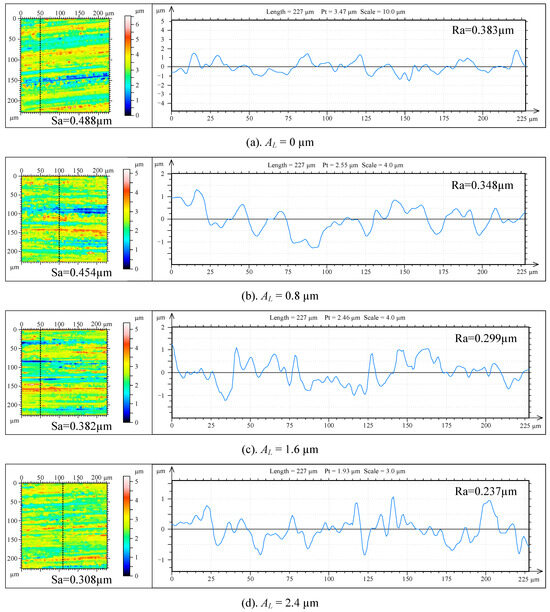 It can be seen from Figure 15a that when AL = 0 μm, the height difference of the micro-surface of the workpiece is 6.5 μm, and there are obvious gullies and bulges. The roughness curve fluctuates greatly, and the mean surface roughness is large. As shown in Figure 15b–d, the surface micromorphology gradually becomes flatter, with gullies and bulges of gradually decreasing amplitude, while increasing the longitudinal ultrasonic amplitude to 0.8, 1.6 and 2.4 mm. The fluctuation of the surface roughness curve is gradually gentle. The arithmetic mean of surface profile height decreases gradually.