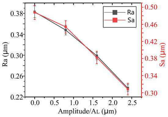 As shown in Figure 16, as the longitudinal ultrasonic amplitude AL increases from 0 μm to 2.4 μm, the surface roughness Ra decreases from 0.383 μm to 0.237 μm, with a decrease of 38.1%, and Sa decreases from 0.488 μm to 0.308 μm, with a decrease of 36.9%.
