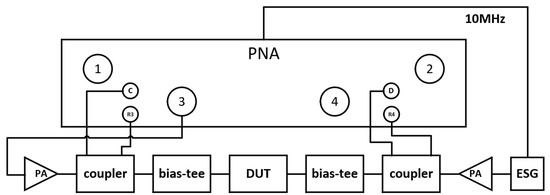 Additionally, the test system employs external bi-directional couplers to measure the incident and reflected waves, which are fed into the VNA to provide shorter test paths for the incident and reflected waves compared to the conventional approach using the internal couplers of the VNA. As a result, the loss of incident and reflected waves in the transmission path is minimized, leading to more-precise and -stable wave testing by the receiver. Moreover, we can enhance the test system’s upper power limit by incorporating an attenuator on the coupler, thus relying on the upper limit of the RF probe test power. The MPI T50 Ground-Signal-Ground (GSG) RF probe was used in this experiment, which has a power limit of 5 W (approximately 36.99 dBm), effectively improving the test power upper limit of the system. To apply DC bias to the DUT, two BT-0040 Bias-Tees from Marki Microwave, are connected to the DC source (Keysight B1500A), manufactured by Keysight Technologies in Santa Rosa, CA, USA.