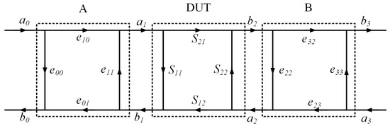 The above diagram can be further abstracted to a generic error model, as shown in Figure 7, where are the error terms of Block A and are error terms of Block B. We can use an 8-term error model [16], as shown in Equation (6), to describe the calibration process to determine the 8 error terms from the measured , and waves, which consist of a set of measured uncorrected s-parameters over the calibration standards, as well as power measurement results.