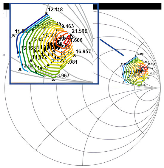 When evaluating the RF robustness of a device, the test is usually performed at a constant VSWR circle centered at 50 ohm. However, the optimum impedance point of a device is usually a complex impedance, and in practical applications, the device is usually matched at the optimal load impedance point. Therefore, it is more interesting to evaluate the robustness around the optimal load impedance, which is more in line with the actual working environment of the device [17]. In this case, we can determine the trace of the VSWR circle using Equations (3) and (4), where is the center of the circle and R is the radius.