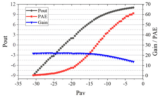Firstly, we performed the power sweep to find the P1dB compression point when the load impedance was 50 Ohm. Then, we performed a load pull test at this input power to find the optimal impedance. The test results are shown in Figure 9, where the output power contours show that the load impedance when the Pout was maximum was Ohm. We can obtain the performance of the device at impedance matching by performing the power sweep test at this point, and the test results are shown in Figure 10. At the P1db compression point, the transducer gain was 21.07 dB, the output power was 7.77 dBm, and the power added efficiency (PAE) was 29.23%.