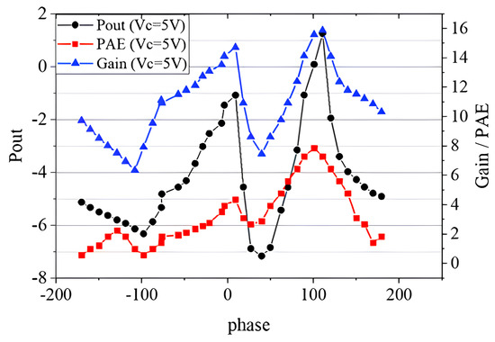 To test the characteristics of the device under load mismatch, we first set up the VSWR circle with 50 Ohm as the center of the circle according to the conventional method. When VSWR = 10, the selected impedance points are shown in the red square in Figure 11. The output power and efficiency results are shown in Figure 12. It is obvious that the performance of the device was significantly reduced compared to the load at the optimum impedance since the output power was degraded to less than 6 dBm from 7.1 dBm. It can also be seen that the device achieved its best performance when the phase was around 20. When V, the maximum output power was 5.95 dBm, which was 23.4% lower than when the load was matched; the maximum PAE was 20.67%, down about 29.3%; the maximum transducer gain was 21.03 dB, which was not much different from when the load was matched.