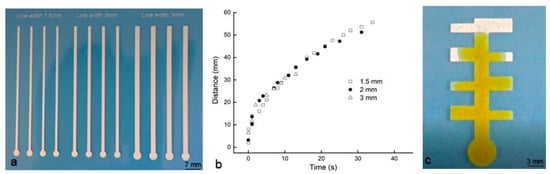 Figure 4a shows some straight-channel devices printed with Type II material, and Figure 4b shows the ink flow kinetics within the channels with different widths. The aqueous ink flows rapidly in the section close to the inlet and then slows down as it travels further. The flow at the beginning is complicated, as part of the applied ink was observed moving rapidly on the channel surface. After passing a certain distance, the ink only flows within the channels and the flow velocity gradually reduces with time from 1.4 mm/s to 0.8 mm/s. While this velocity is higher than the flow velocity in typical paper-based microfluidic channels, the flow within the printed channels has similar characteristics to the flow in typical paper-based microfluidic channels [,,]. This type of one-dimensional capillary flow was studied in paper channels using the Washburn equation and other models [].