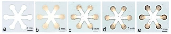 Images of the printed microfluidic devices tested with artificial urine solutions with varying concentrations of glucose: (a), 0 mM; (b), 5 mM; (c), 10 mM; (d), 15 mM; and (e), 25 mM. Type II material was used to print the devices using a screen printer.