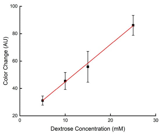 Since the printed devices are composed of alumina and silica particles and the pores (Figure 3d,e) in the devices are interparticle voids, 3-aminopropyltrimethoxysilane was chosen for surface modification. This chemical is widely used in surface modification for biosensing [], as it contains three hydrolysable substituents to react with up to three OH groups on the alumina and silica particles and an amine group that can interact with an enzyme. The surface-modified devices were compared with the unmodified devices in subsequent glucose sensing. The former ones (Figure 5b) were seen to give higher color uniformity than the latter ones (Figure 5a). This surface modification was thus used for all subsequent tests.