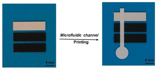 To print electrodes connected to the microfluidic channels, the same screen printer was used. The as-received carbon ink was first printed on PET films using a 200-mesh steel screen, forming the working and counter electrodes. Then, the commercial Ag/AgCl ink was printed on the films using a 200-mesh polyester screen to form reference electrodes. Finally, microfluidic channels were printed over the electrodes after proper alignment. Each layer was dried at 120 °C.