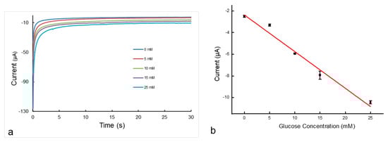 The printed-device performance in cyclic voltammetry was evaluated first to confirm the reversible redox reaction of potassium ferricyanide and diffusion-controlled kinetics, as reported in paper-based devices [,]. Then, the devices were tested for chronoamperometry for glucose sensing by following a reported method [,]. As explained above, glucose oxidase produces gluconic acid with concomitant reduction of potassium ferricyanide to potassium ferrocyanide. Electrochemical oxidation back to ferricyanide gives the current that can be measured using chronoamperometry. The current over time was measured for various concentrations of glucose, as shown in Figure 9a. The observed current after 30 s was used to create a calibration curve, as seen in Figure 9b. The calibration curve shows that the current is linearly proportional to the glucose concentration when the concentration is between 0 and 25 mM. A limit of detection (LOD) of 0.25 mM was calculated using the method reported in []. This LOD value is similar to the value of 0.21–0.35 mM obtained from the electrochemical detection of paper-based microfluidic devices [,,]. It shows that the performance of the printed devices is comparable to paper-based devices with similar structures when using the same test method.