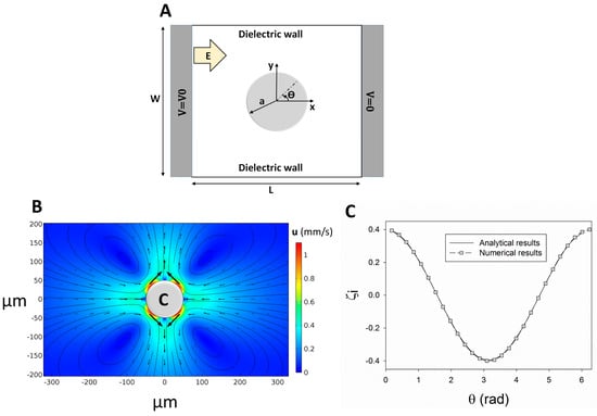 where “a (m)” is the cylinder radius, E0 (V/m) is the applied uniform electric field, and θ is shown in Figure 1A. For instance, Equation (11) is used to determine the IZP on a 2D circular conducting cylinder with the radius of a = 50 µm within a 40 V/cm electric field inside an enclosed chamber with L = W = 1 mm (Figure 1A). The IZP on the cylinder surface generates MVs around the surface (Figure 1B). The numerical results of the IZP distribution within a uniform applied electric field are in good agreement with the theoretical results proposed by Squires and Banzant (Figure 1C) [].