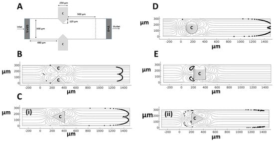 Different shapes and configurations of hurdles within the microchannel for assessing the efficacy of bioparticle trapping (t = 5 s after releasing 100 bioparticles). (A) The microchannel model of Wu and Li []. (B) Two triangular conducting hurdles, (C) triangular hurdles with different directions of (i) and (ii), (D) a cylindrical hurdle, and (E) a rectangular hurdle.