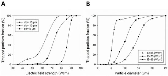 The effects of the EFS and particle/cell diameter on the efficacy of particle trapping in the MVs are further investigated. Figure 4A shows the effect of increasing the EFS on the entrapment of cells with different diameters of 5, 10, and 15 µm. The results show that the trapping fraction increases with the rise in the EFS, where above 90% of 10 µm cells are trapped in EFSs higher than 85 V/cm. The main reason for the escaping of some particles is the EOF flow near the wall where these particles enter the near-wall diffuse layer and flee from the MVs. Such partial entrapment was shown to be reduced for smaller cells due to their smaller response to the drag force. Table S2 contains the corresponding raw data of Figure 4A.