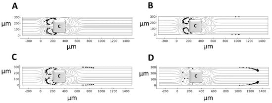 The validated numerical model is used to assess the capability of induced MVs to separate CTCs (15–30 µm) from red and platelet cells (1–8 µm) []. A conducting hurdle is placed in an EOF, and the effects of the key parameters, including hurdle geometry, EFS, and wall zeta potential for particle trapping within the induced MVs, are evaluated. The microchannel model was first employed (Figure 2A). Different hurdle shapes, including the microchannel proposed by Wu and Li [] as well as cylindrical, triangular, and rectangular hurdles, were employed to find the most efficient configuration for particle/cell separation (Figure 2). The boundary conditions (BCs) and material properties for these configurations are listed in Table 1, and their trapping efficiency is evaluated in a 100 V/cm EFS for different sizes of cells. The results show that only the induced MVs around the rectangularly shaped hurdle lead to full cell entrapment due to the higher distance between the induced frontal and rear MVs around the hurdle (Figure 2).