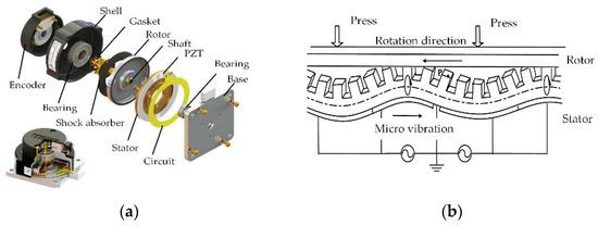 USM has no conventional motor windings or magnetic circuits. It utilizes the vibration of the elastic body (stator) in the ultrasonic frequency band and the reverse piezoelectric effect of piezoelectric materials. The mechanical movement and torque are obtained by means of the frictional contact force between the stator and rotor [19], as shown in Figure 2b.