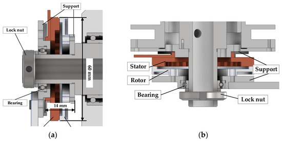 The structure of the traditional traveling wave USM is shown in Figure 2a. Besides the stator and rotor of the motor, there are some auxiliary structures to maintain the pressure and coaxiality between the stator and rotor. For lightweight design, both axes are driven by hollow USMs, and the stator and rotor of the USM are directly installed on the shaft. In addition, the installation of the USM on the pitch-axis system is different from the azimuth-axis system. The USM rotor on the pitch-axis system is fixed on the shoulder by a support and drives the pitch shaft to rotate, as shown in Figure 3a. There is a bearing inside the stator fixed support; the outer ring of the bearing interference fits the support, and the inner ring clearance fits the pitch shaft. Thus, preload pressure between the stator and rotor can be provided by an elastic pad and a lock nut on the outside of the bearing.