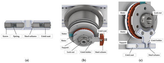 The internal structure of the limiter is shown in Figure 4a. Two steel columns are tightly held against the limit holder under elasticity. On the pitch- or azimuth shaft, the limit holder is fixed on the rotor or stator support, the limit seat is fixed on the base, two springs and two steel columns are inserted into the through hole of the limit seat, and the spring pre-pressure is adjusted by the screws at both ends, as shown in Figure 4b,c.