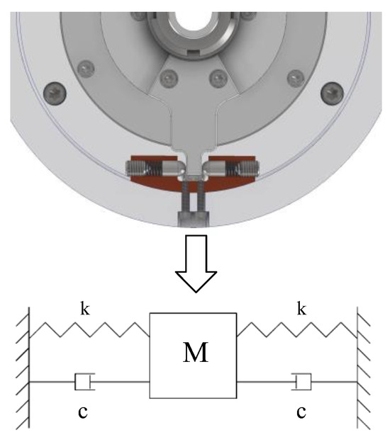 Figure 5 shows the 3D model of the limiter structure and a simple model. When the USM suddenly stops from a state of motion, the stator and rotor are locked; thereafter, the motion of the axis system can be regarded as a damped single-degree-of-freedom vibration system. The pitch shaft, stator, rotor, support, and limit holder can be regarded as a rigid element; the spring in the limit seat is an elastic element. To more easily understand the mechanical relationship between the shaft and the limit mechanism, the abstract model represents the small rotations of the shaft, stator, rotor, support, and limit holder as flat movements.