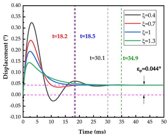 The equivalent mass of the axis-system mechanism is g, and the equivalent spring elasticity coefficient N/M. The critical damping of the system can be calculated as N/(m/s). From the MATLAB simulation, the velocity is taken as rad/s, and the additional torques generated by considering the load eccentricity without considering the deformation of the axis system are taken as N. The results with different damping ratios are shown in Figure 6. The response time t occurs when the difference between the current position and the steady-state position is less than . It is observed in Figure 5 that the system generates a positioning error due to the eccentric load.