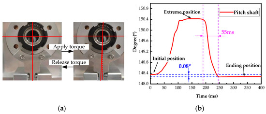 The response characteristics of the pitch-axis system limit mechanism at the limit position were tested. The limit holder was placed on the limit position from the initial alignment position under external torque, and the external torque was withdrawn, as shown in Figure 8a.