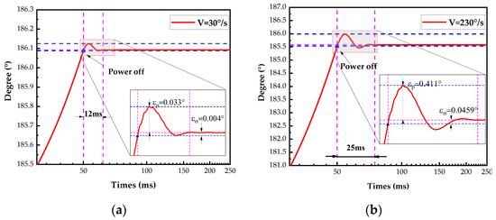 When the shaft turns to the target position (186.09°) at a speed of 30°/s, the ultrasonic motor is immediately powered off. Due to the inertia of the axis system, the shaft crosses the target position. Under the action of the limiter, after about 5 s, the shaft stops at the limit position (186.23°), then after a small shock, about 7 ms, it returns to the target position with an error of 0.004°, as shown in Figure 9a. When the shaft is rotating at high speed (230°/s), the trend shown in Figure 9b is similar to that at low speed. Both the overshoot and error of limit mechanism alignment are increased, but the positioning time increased by only 13 ms. The positioning is extremely fast and with good positioning accuracy.