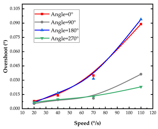 After the USM drive axis system had been running steadily for two rotations at four different velocities, it was powered off. The pitch-axis overshoot at different positions after power-off is shown in Figure 10. The velocity is positively correlated with the amount of overshoot, which varies at different positions.
