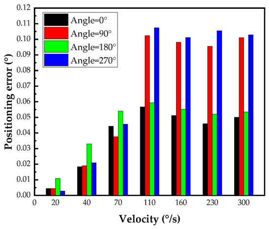 At velocities less than 70°/s, the positioning error increases with velocity; the maximum positioning error . At velocities between 100°/s and 300°/s, the positioning error has no obvious impact on velocity but has an obvious correlation with the position. The positioning errors at 90° and 270° are much larger than those at 0° and 180°. It can be concluded that the resistance torque is greatest at the 90° position, which is consistent with our inference. In practical applications, different error compensations can be established by considering the speed and angle to improve the accuracy of the optoelectronic tracking platform.