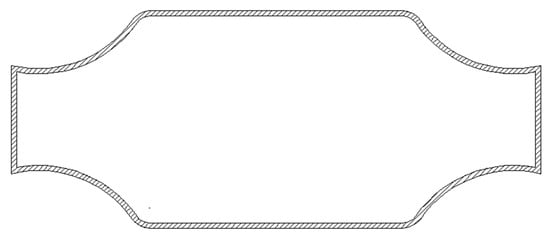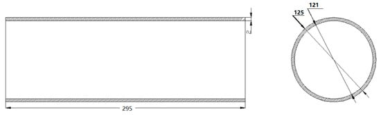 Spin testing was carried out using parameters shown in Table 3, and DR, rp, and β’ are the parameters of wheel diameter, fillet radius, and attack angle, respectively. The pipe wall thickness was t = 2.0 mm, the pipe length was L = 295 mm, and the outer diameter of the welded pipe was D0 = 125 mm, as shown in Figure 3. The spinning diagram is shown in Figure 4. A visual sketch of the welded pipe after spinning is shown in Figure 5.