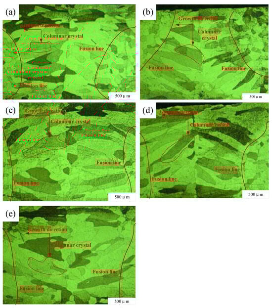 Because the welding input was the same, the spot diameter of 0.6 mm enabled the unit area to contain more laser energy, and the narrower weld width increased the heating and cooling speed of the weld. This made the columnar crystal size of the weld smaller and more prone to the phenomenon of component sub-cooling, making the equiaxial dendrite structure easier to generate during weld solidification [], as shown in Figure 6. With the increase in spot size, the columnar crystal size of the welded joint also increased significantly. Larger grain size means smaller grain boundary areas, which have a lower inhibition effect on dislocations from external forces. Therefore, different spot sizes changed the weld section size, grain sizes, and grain boundary areas, which were the main reasons for differences in tensile strength and elongation after fractures of welded joints.