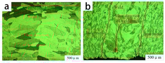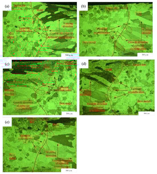 where N0 and ΔT are determined by the specific material composition, and G and ΔTN are determined by the specific welding technology. ΔT is the undercooling of the molten pool, ΔTN is the undercooling of the equiaxed grain nucleation point, N0 is the number of nucleation points, and G is the temperature gradient. According to Equation (2) and the metallographic images (Figure 6), as the spot increased, the weld width increased, the temperature gradient G decreased, and the nucleation undercooling ΔTN of the weld metal in the molten pool decreased, which is less conducive to nucleation. The equiaxed grain zone of the joint therefore decreased with an increase in spot diameter.